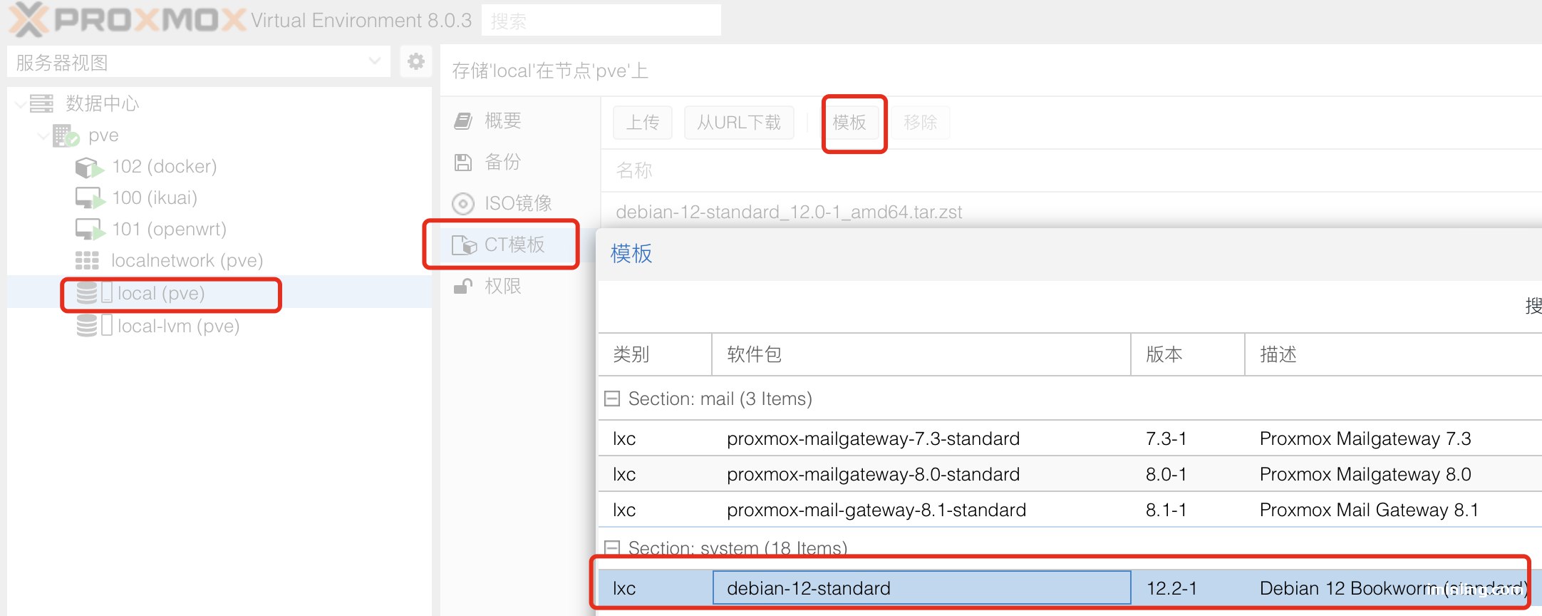 - 在经过前面几篇的换源操作后,CT模板应该就能顺利下载了 为了不影响PVE宿主机,通常使用套娃的形式安装Docker容器,再安装相关Docker应用。因此首先在CT模板中创建 Linux 容器,推荐使用Debian。开启SSH登录,修改LXC Debian,部署Docker容器。 1、CT模板下载 点